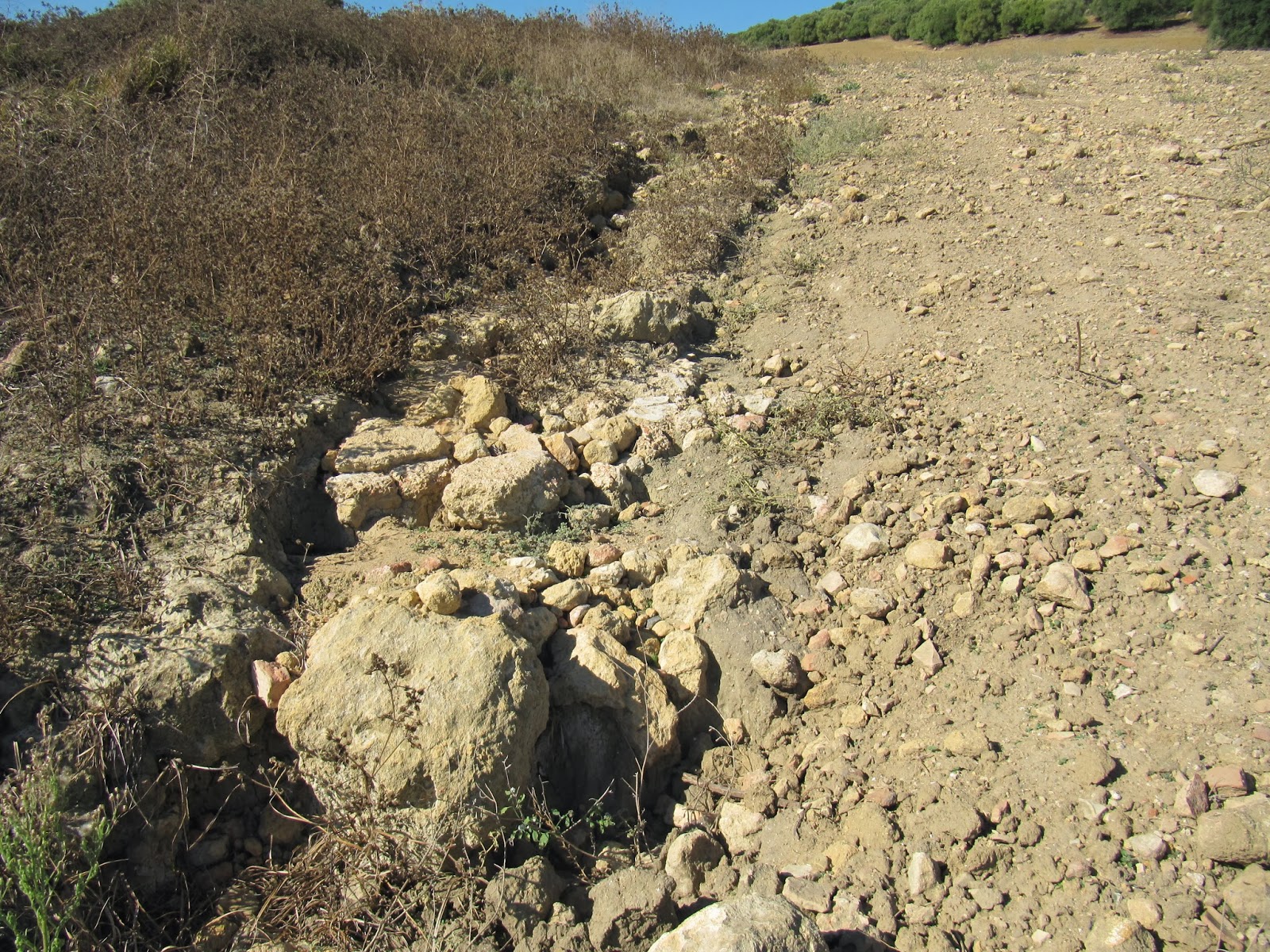 En el nuevo sector de grandes galerías encontramos nuevas obras de refuerzo de mampostería pero el arco de medio punto ha sido sustituido por grandes piedras y creo que porque el arco original de ladrillo se derrumbó, ya que sobre los muros de piedras persiste la forma y el hueco vacío del arco en la roca. En las oquedades y salientes de esta zona aparecen muchos ladrillos sueltos quizás provenientes del desplome de dicho arco. En todo este sector aparecen una gran cantidad de ladrillos reforzando algunas zonas de la galería, todos con las mimas medidas que los anteriores . Este ramal se dirige paralelo a la carretera del Viso a Carmona, es decir con dirección Noroeste y es el más largo de la mina, estando pendiente de explorar y topografiar completamente. Hemos localizado en esta zona un antiguo manantial, situado a unos metros por encima del cauce de la galería con acceso al exterior mediante una rampa y que actualmente está completamente seco.