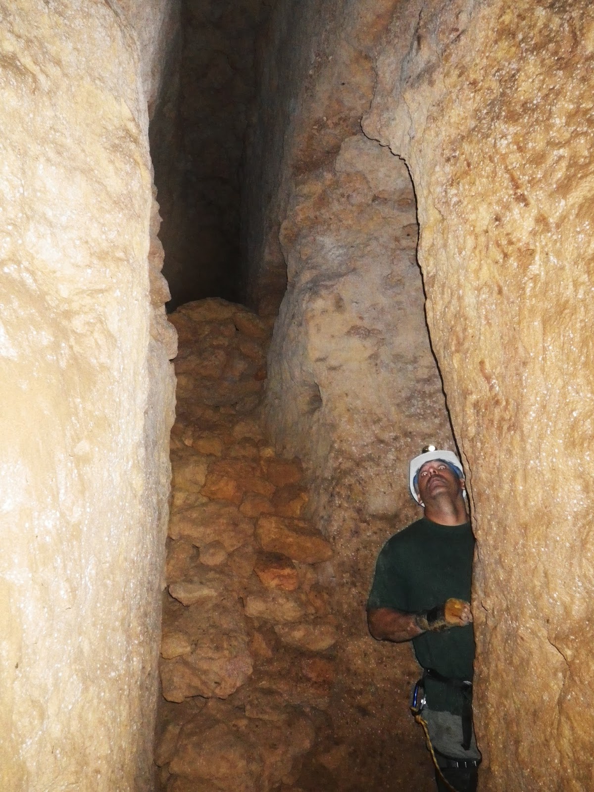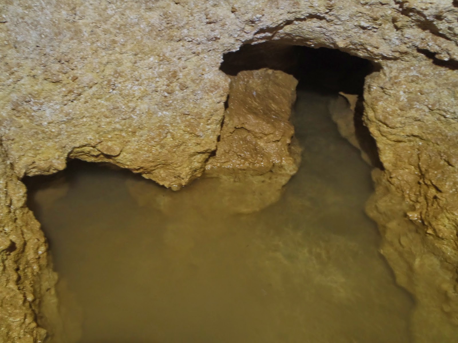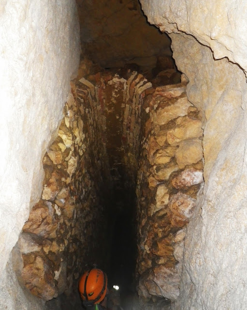 La galería se desarrolla sin pozos al menos un centenar de metros hasta que conecta con un nuevo sector donde se recuperan las grandes alturas y los pozos situados a distancias regulares de unos veinte metros. La explicación que puede tener esta galería de conexión sin pozos y de menores dimensiones entre dos grandes sectores de la mina puede ser simplemente la de ahorrar trabajo. Parece evidente que la galería en esta zona se desarrolla en un estrato de caliza muy compacta y dura, es casi como hormigón. La excavación en este punto debió de ser costosísima. Al no poder «puentear» este estrato y siendo necesario para alcanzar nuevos manantiales se optó por atravesarlo excavando lo mínimo y sin pozos hasta llegar a una zona de roca arenisca más blanda. ¿Como se orientaban los trabajadores para llevar la galería en la dirección correcta excavando bajo tierra es aún un misterio?, puede que se guiaran por veneros de agua ya existentes o que utilizaran métodos trigonométricos.