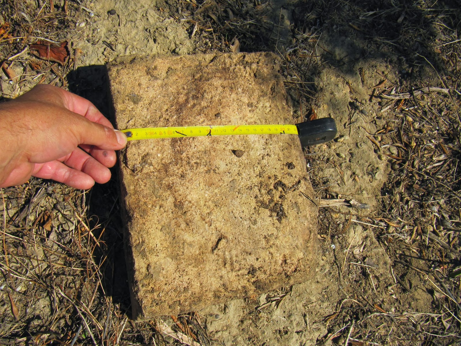 Recorridos unos ciento setenta metros llegamos a un muro de ladrillo moderno realizado para represar el agua y sobre el que se abre un pozo cubierto con una nueva caseta de captación la primera vez que accedimos a la mina lo hicimos por este pozo en el que existe una escalera de hierro en muy mal estado y a la que le falta la parte inferior por lo que descendimos rapelando. En este punto la mina ya adquiere unas dimensiones uniformes de unos cinco metros de alto por setenta de ancho y los pozos se distancian entre ellos a patrones constantes de 18.7 metros siendo la profundidad de los pozos también muy constante de unos 10 a 11 metros (la galería de la mina es prácticamente horizontal por lo que a discurrir bajo un llano la profundidad es más o menos constante). Se aprecian lucernarios a diferentes alturas y espaciados algunos metros unos de otros. Recorridos 236 metros a una dirección casi constante que oscila entre los unos 315 y 340 grados la galería gira para tomar una dirección casi exacta de 360 grados, es decir al Norte. Es en este sector donde encontramos la primera obra de refuerzo consistente en una bóveda de ladrillo de medio punto con sustentación a base de muro de mampostería todo unido con argamasa y con unas dimensiones de unos siete metros de largo por unos cuatro de alto. Los ladrillos que hemos podido medir son todos de factura romana con unas dimensiones de 29,6X22X0,6 cm. un pié romano de largo por medio pie más un cuarto de ancho, un ladrillo muy común de la Bética romana de época Imperial. La siguiente foto es un detalle de uno de los ladrillos extraídos de la mina para su estudio y que se encontraba suelto.