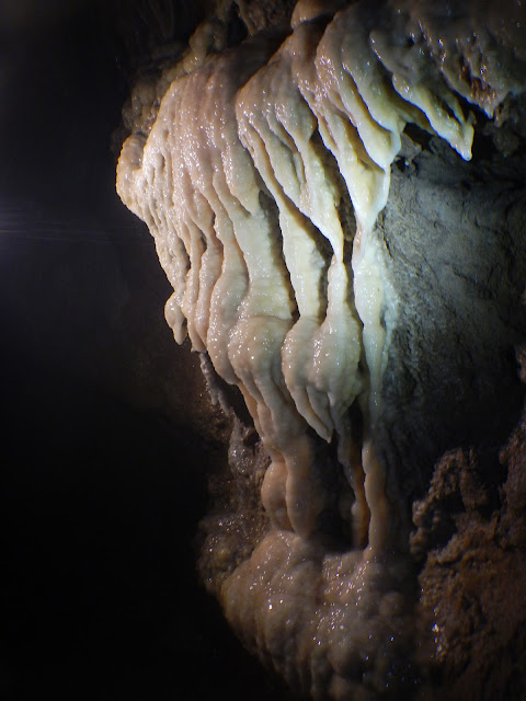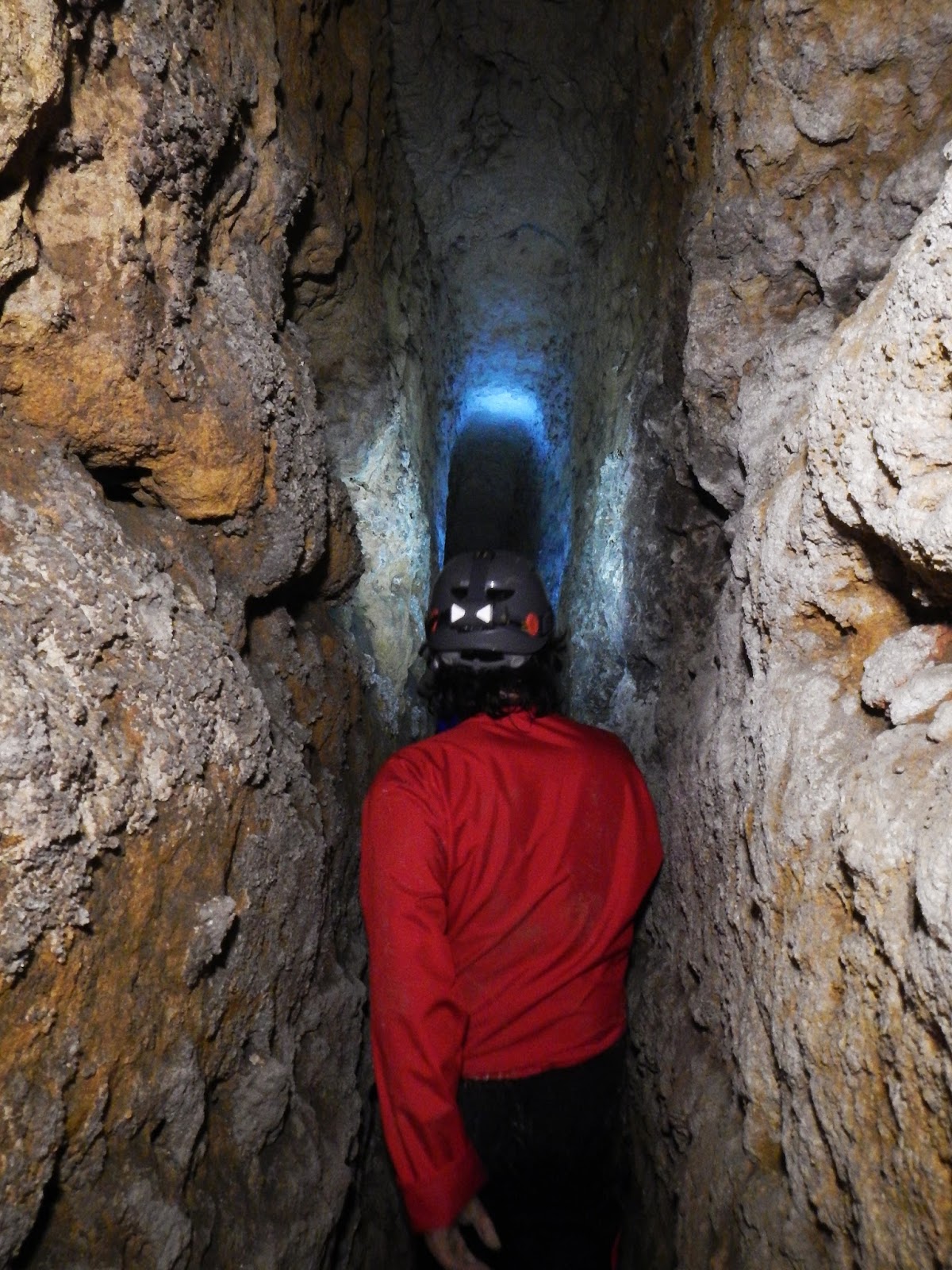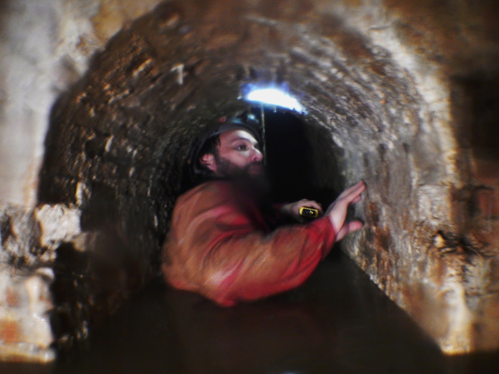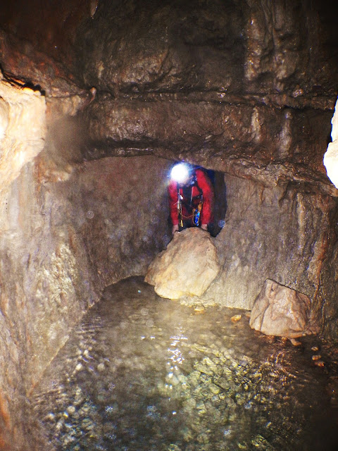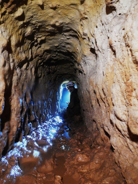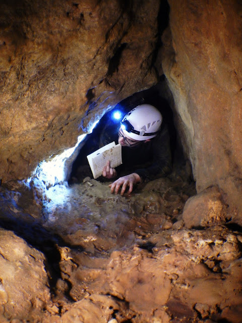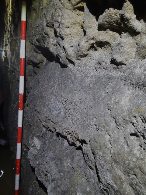 | Descendiendo el pozo que ha sido reexcavado sobre un pozo primitivo más pequeño. |