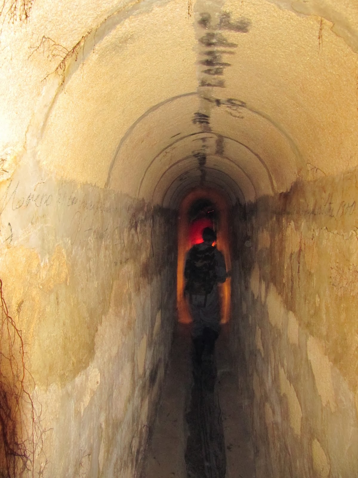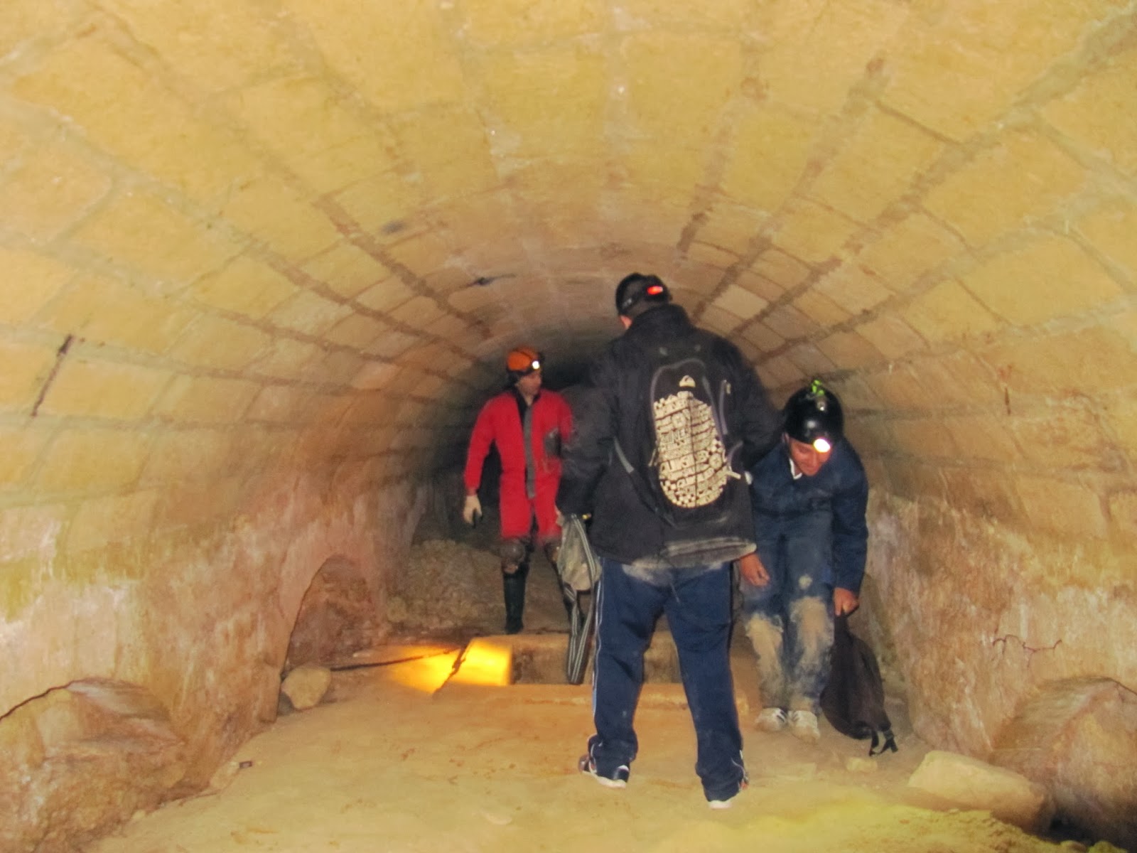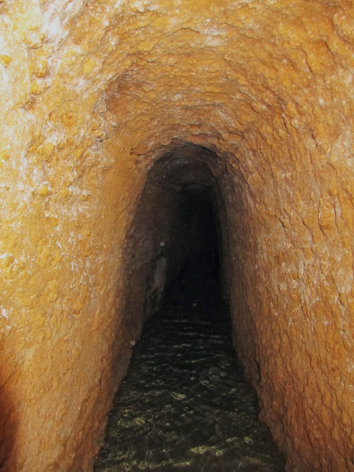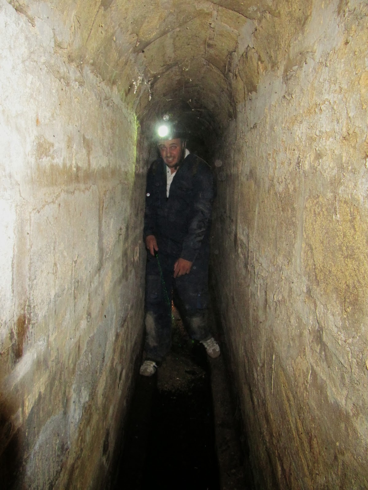 Volviendo sobre nuestros pasos y tomando el ramal que se dirige hacia el este entramos en un sector de menores dimensiones y que presenta continuos revestimientos con sillares de cantería exquisitamente tallados, tanto en los pozos de registro como en la pared derecha que está completamente sellada. Al poco llegamos a un cruce bajo un pozo de registro que conecta con la galería de conducción que llega al Puerto. Esta galería está completamente revestida con muros de sillares y ladrillos y rematada con un arco de medio punto realizado con dobelas de cantería .Tiene una dimensiones medias de algo más de dos metros de altura por un metro de anchura. El agua va canalizada por una arqueta de unos veinte centímetros de fondo revestida con mortero. Presenta pozos de registro a distancias variables, en algunos casos más de doscientos metros. Existen dos arcas de aguas en este sector. La primera está en el mismo punto por donde accedemos a la mina , tiene los accesos tapiados y esta muy deteriorada, faltando la cubierta. La segunda se encuentra a unos trescientos metros de distancia siguiendo la galería y aún conserva la escalera de acceso al exterior y toda su estructura en pie. El resto de la galería recolectora que se desarrolla hacia el este tiene una morfología algo compleja y curiosa, está revestida con sillares en muchos puntos y en las paredes enlucidas con estuco se conservan, entre pintadas recientes, multitud de grafitis, algunos fechados desde el siglo XVII al XIX y realizados, la mayoría, por los ingenieros que visitaron la mina durante sus consecutivas reformas.