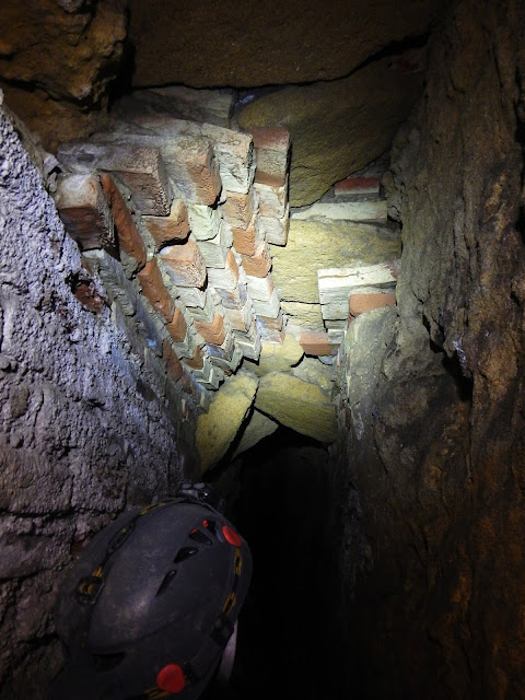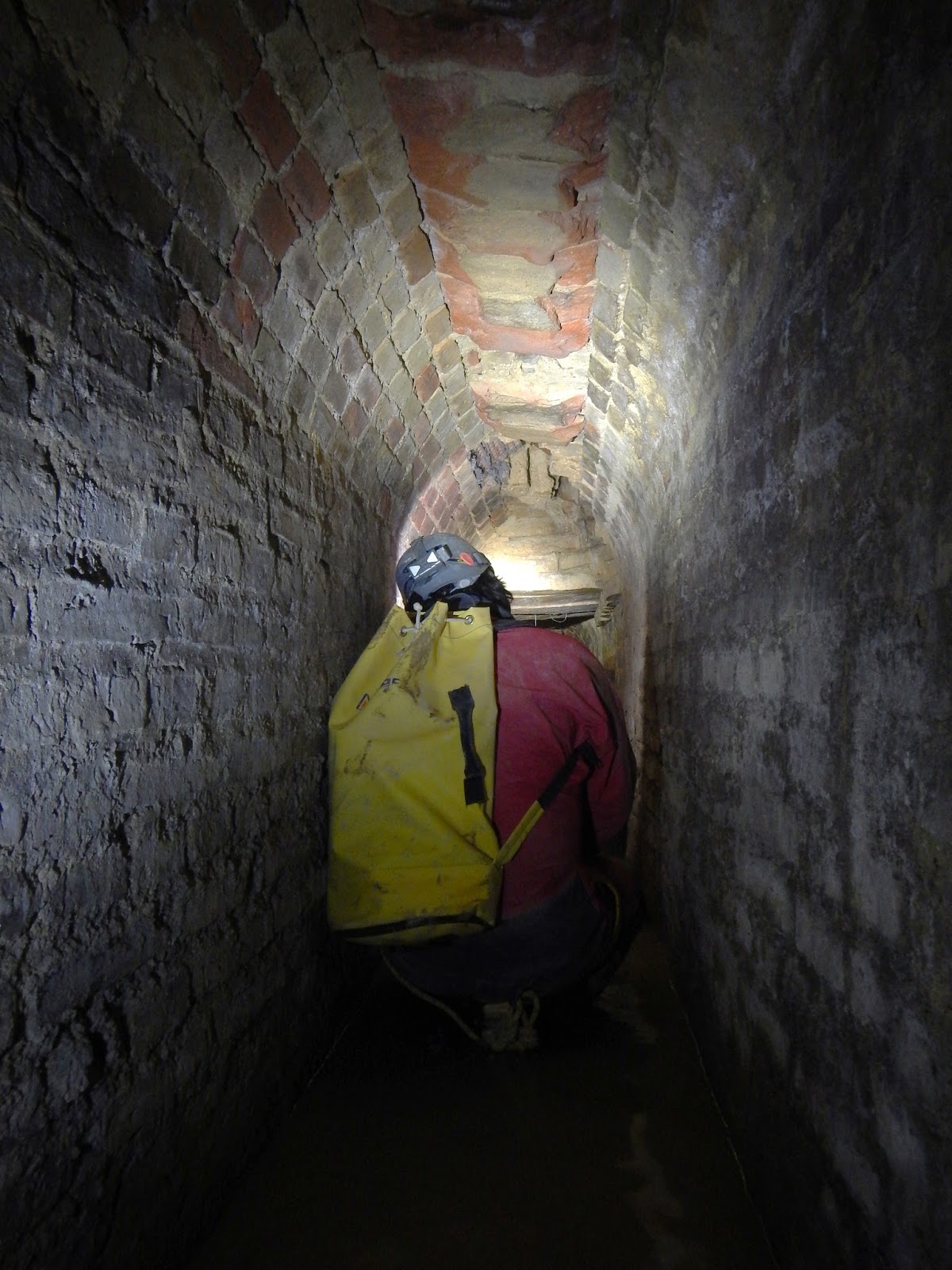 Arriba la zona inicial del conducto de ladrillo en el que desemboca la mina, abajo zona donde cambia la bóveda y se reduce la altura.