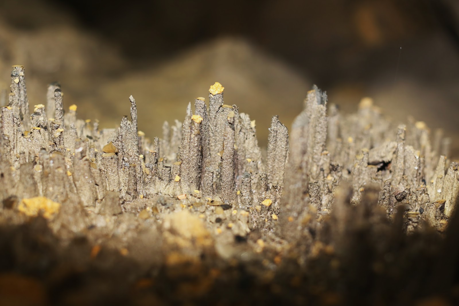 | Arriba imagen en detalle de las «Chimneas de hadas» Foto: Agustín Díaz. Abajo detalle de las pisolitas y de una colada. Fotos: José Millán. |