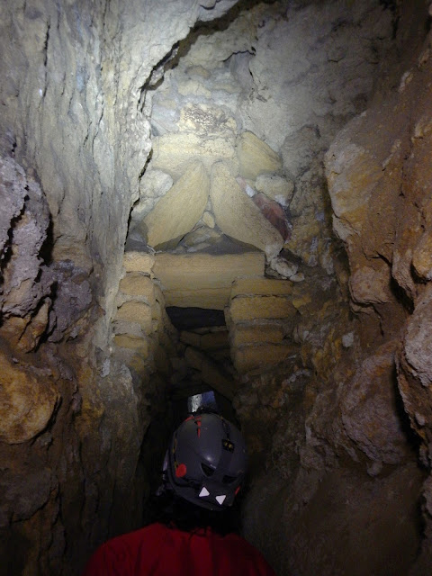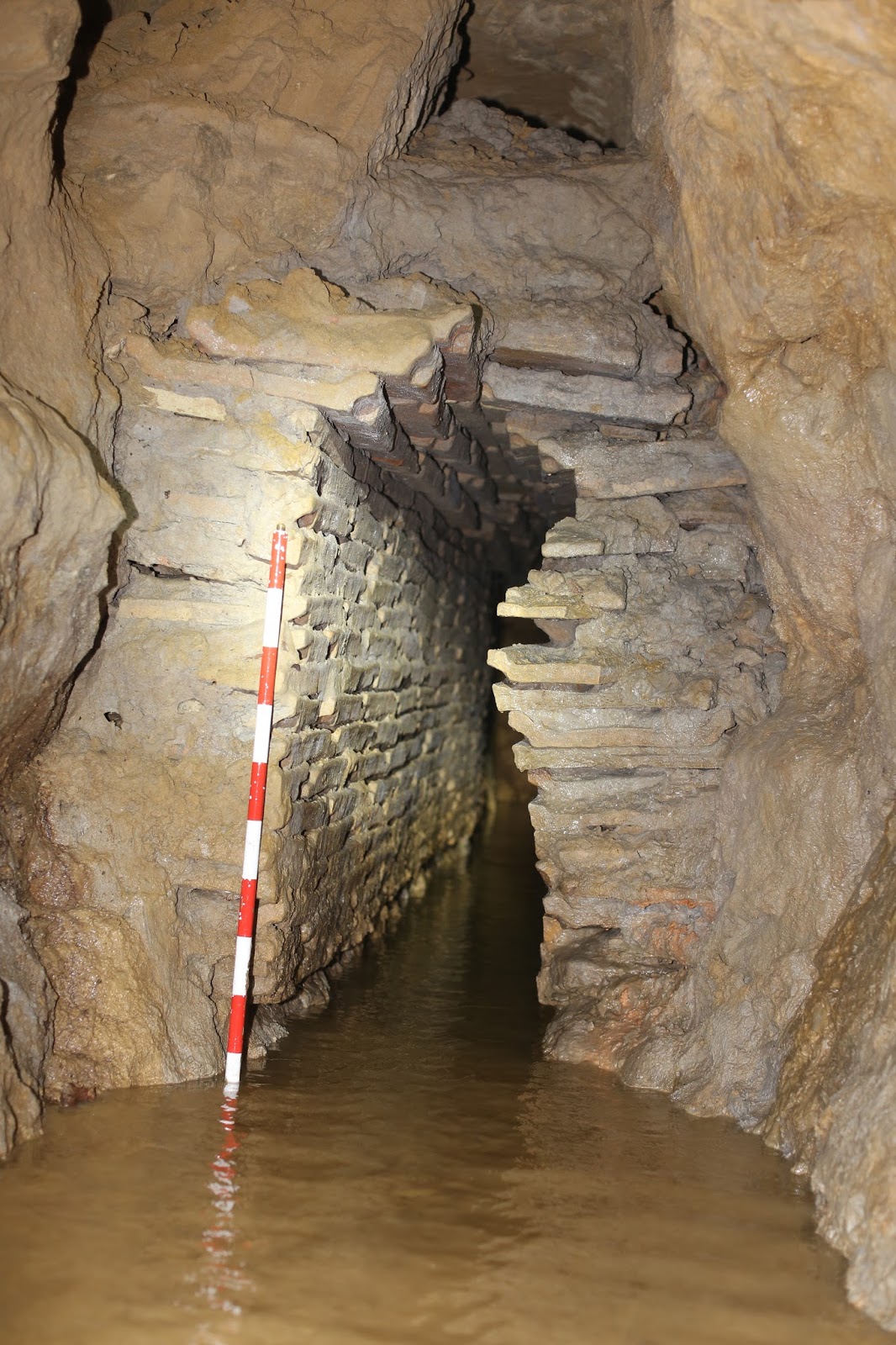 La situación de esta lumbrera, en línea con la galería explorada hasta ahora la convirtió en objetivo preferente para poder continuar las exploraciones. El acceso por esta lumbrera nos permitió, tras una desobstrucción, explorar nuevos tramos de galería. A favor de las aguas pudimos recorrer el ramal que ha de conectar con el pozo nº 28, donde se hallaba detenida la exploración, por desgracia a los 22 metros nos encontramos con un derrumbe que nos lo impide , quedando un tramo de 30 metros entre lumbreras por explorar. La galería aparece llena de formaciones calcáreas en forma de estalagmitas y coladas y las paredes están, como en tramos anteriores, parcialmente derrumbadas, siendo visibles los trabajos de limpieza realizados para liberar el flujo de agua. Apreciamos hiladas de tégulas situadas bajo el nivel de agua y que sirven de refuerzo de las paredes y junto con ellas restos de costeros de madera muy deteriorados y que parece que cruzaban la galería de una pared a otra, por lo que podrían tener una función de contención, para evitar el colapso de las paredes. Se toman muestras de la madera para su datación. En las fotos vemos arriba la característica cúpula que cerraba la lumbrera de Los Pintores, en medio vemos el acceso al pozo por un hueco redondo entre dos losas de piedra labradas y abajo vemos los restos de los costeros de madera que debieron ser colocados para evitar derrumbes, lo que vemos bajo las madera son hiladas de tégulas..