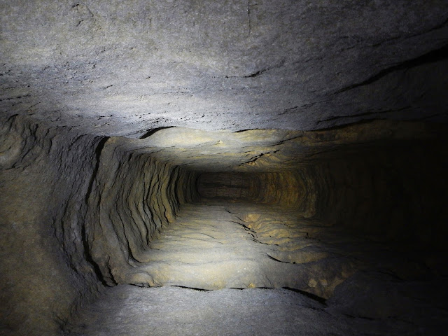 Imagen del pozo situado en la 3º bifurcación de la galería de las cucarachas donde se aprecian los estratos de calcarenita que han sido cortados por la excavación del pozo.