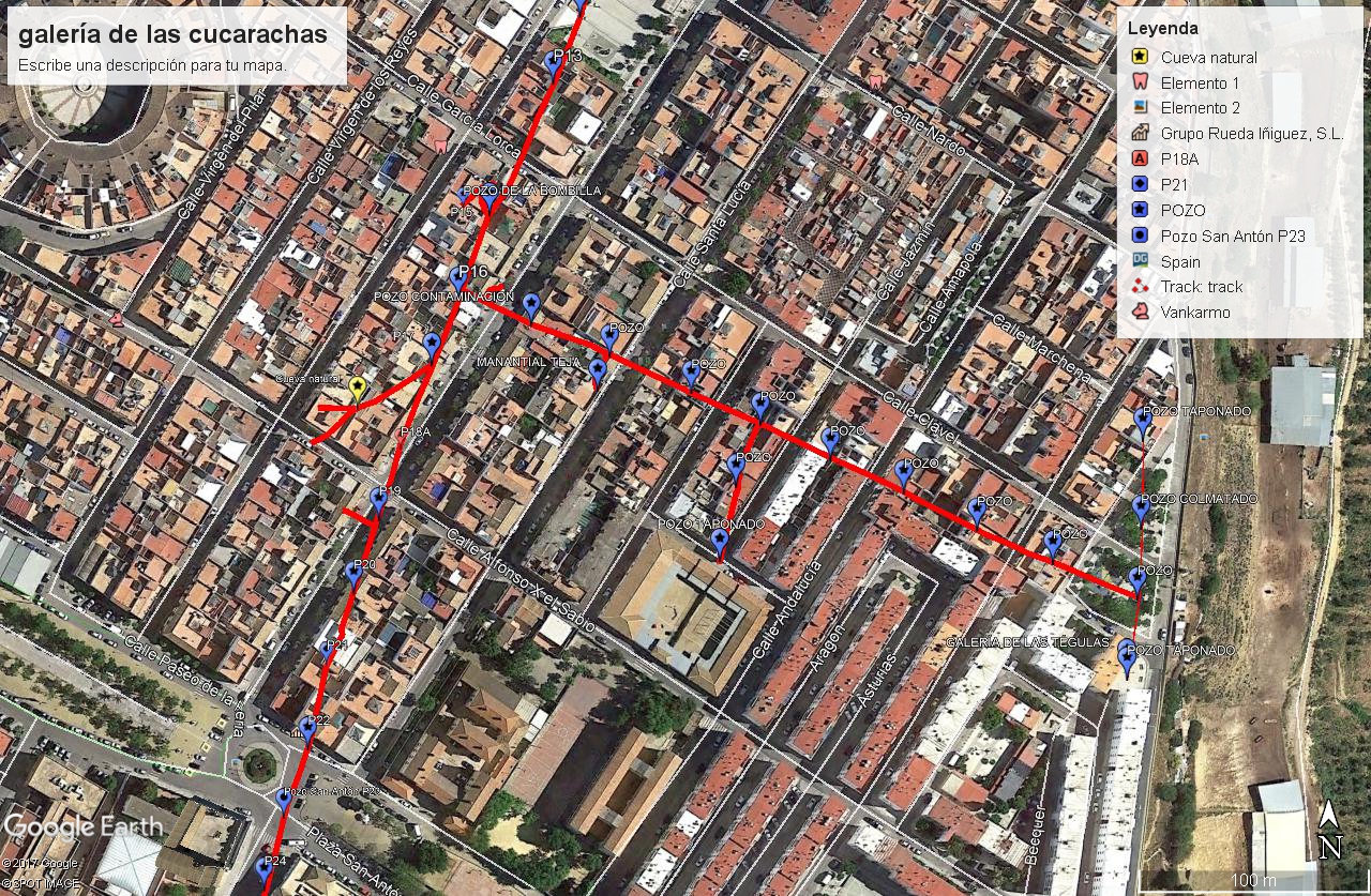 .Imagen de Google de la zona final de la mina en la barriada de Los Pintores. En rojo las galerías exploradas y en amarillo los trazados a los que no se ha podido acceder por taponamientos.